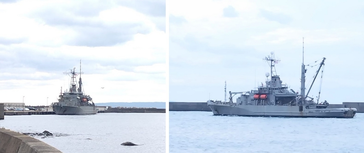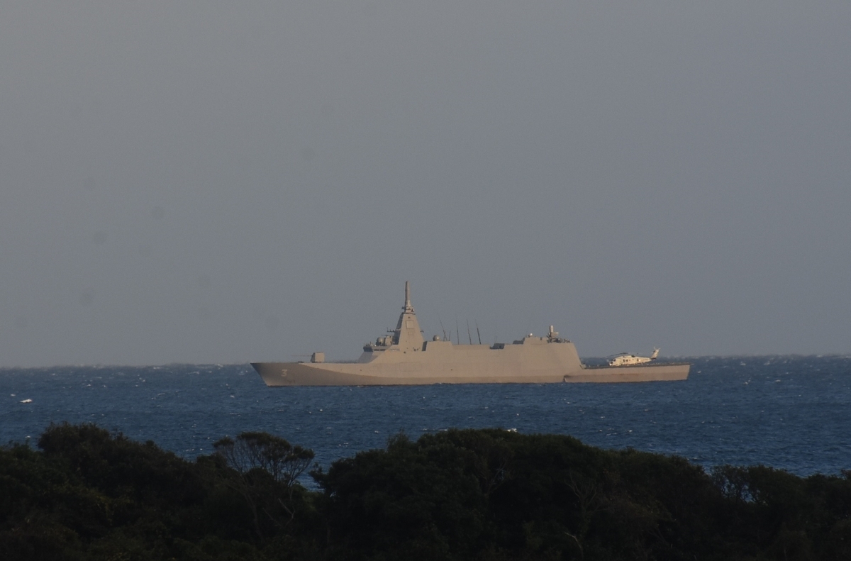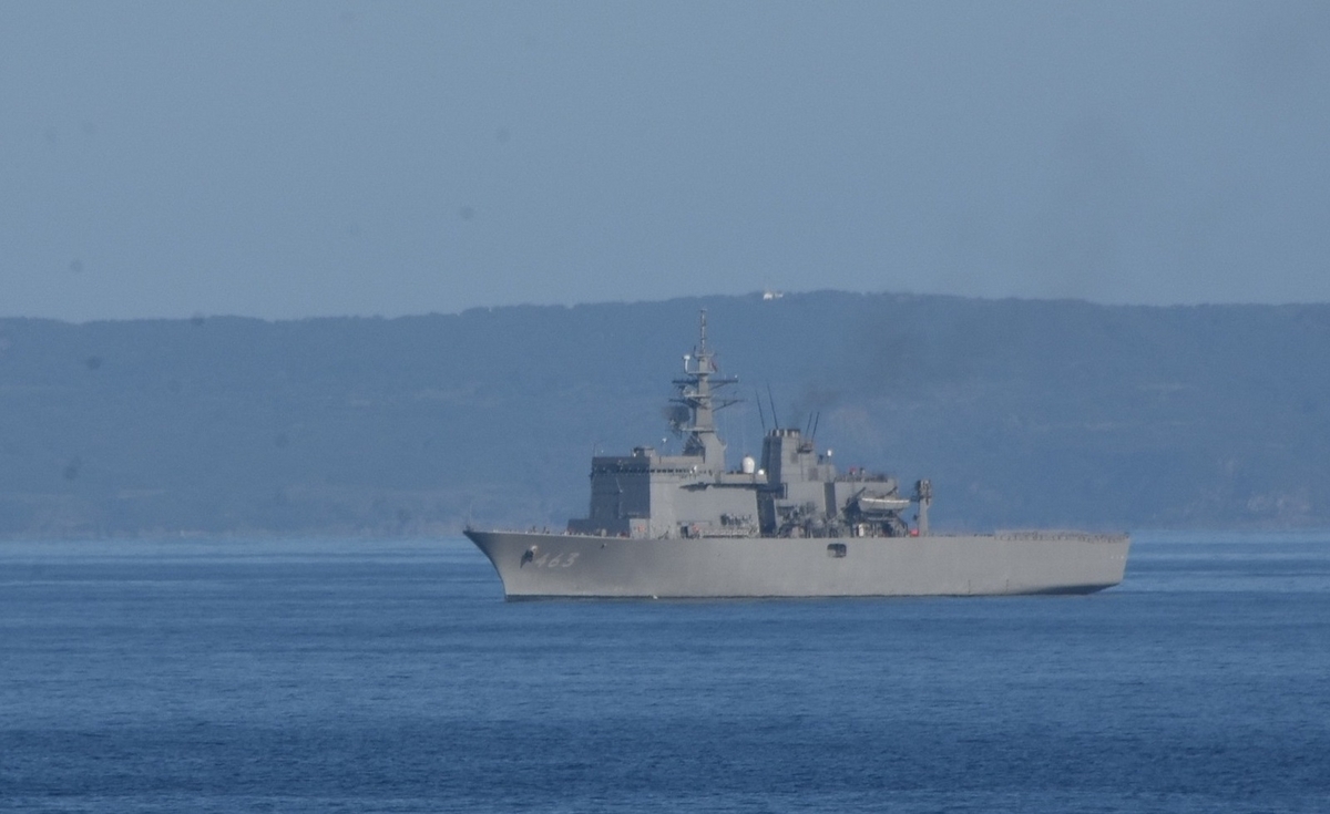 安房に出向くと、沖合には海上自衛隊の最新鋭もがみ型ヘリ搭載護衛艦『のしろ』の姿が。
